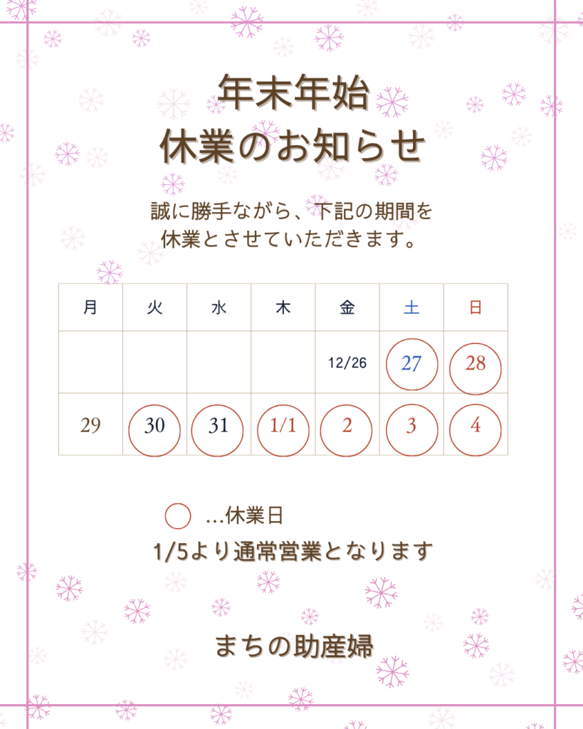 年末年始休業のお知らせ 投稿日 2025年12月26日 著者 town-mw カテゴリー 未分類 まちの助産婦の年内最後の営業は12/29となります。年始は1/5より通常営業となります。宜しくお願い致します。